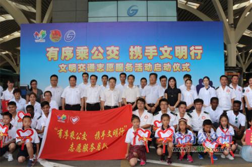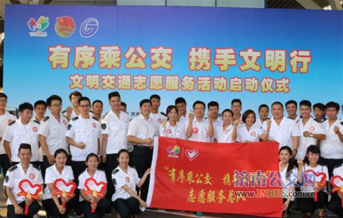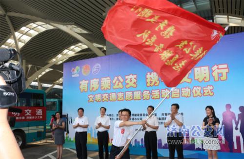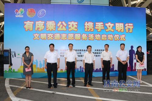 济南公交官网讯 7月10日,由山东省青年志愿者协会发起,市文明办、团市委主办,济南公交总公司团委承办的“有序乘公交 携手文明行”文明交通志愿服务活动在济南西客站公交枢纽正式启动。团省委副书记刘少华,市委宣传部副部长、市文明办主任孙常建,省志愿者行动指导中心主任刘北雪,团市委副书记王友进,济南市公交总公司党委书记、总经理薛兴海,中国太平洋人寿保险股份有限公司济南中心支公司党委书记、总经理祝萌,山东开创集团股份有限公司副总裁兼团委书记马洪出席启动仪式。山东大学国际交流学院的4位留学生朋友、各青年志愿服务站负责人以及来自各行各业的100位文明交通志愿者参加启动仪式。仪式由团市委副书记徐龙义主持。