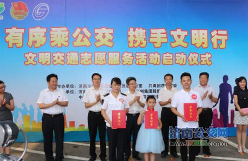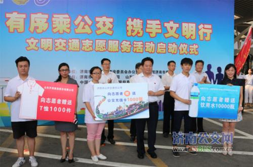 活动中,志愿者行动指导中心主任刘北雪同志,团市委副书记王友进同志向“有序乘公交 携手文明行”文明交通志愿服务公益代言人宋劲彬、董丹和马百钏授予证书;薛兴海总经理、祝萌总经理和马洪副总裁分别向志愿者代表赠送1000张公交卡、1000件志愿者服装和1万瓶矿泉水作为活动保障物资;公益代言人宋劲彬及少先队员代表沈子默共同宣读《“有序乘公交 携手文明行”文明交通倡议书》,号召广大青年和少先队员争做文明交通的践行者、倡导者和志愿者,以实际行动助力创城;团省委副书记刘少华同志为“有序乘公交 携手文明行”志愿服务总队授旗,总公司团委副书记田思民接旗。在一片热情高涨的氛围中,市委宣传部副部长、市文明办主任孙常建同志宣布“有序乘公交 携手文明行”文明交通志愿服务活动启动。启动仪式后,与会领导现场观摩了济南西站公交枢纽志愿者上岗情况,并来到济南西站青年志愿服务岗详细了解志愿者服务情况。