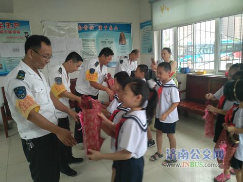 济南公交官网讯 连日高温,有感于127路公交车驾驶员整日接送学生们上学、放学很辛苦,沿线的济南新苑小学2015年一班的16位小同学在家长们陪同下,于7月26日带着小礼物来到127路公交车所属的济南公交七公司五队驻地进行慰问。