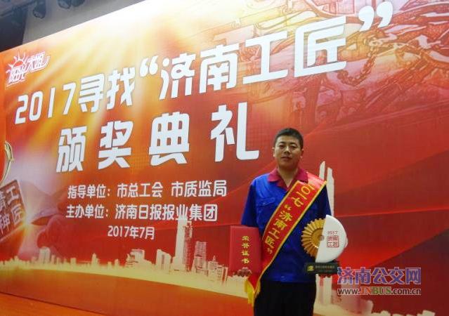 济南公交官网讯 近日,由市总工会、市质监局指导,济南日报报业集团主办,汇聚了全市116名能工巧匠参与评选的2017寻找“济南工匠”颁奖典礼上,济南公交修理工安伟被授予“济南工匠”。