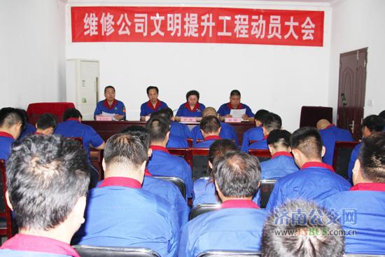 济南公交官网讯 5月9日下午,维修公司召开文明提升工程动员大会,传达5月8日总公司提升工程动员大会精神,启动维修公司“十大行动”为主要内容的维修文明提升工程,努力提升服务质量和维修环境,扎实推进“公交都市”创建工作,为运行一线提供优质的服务和可靠的车辆保障。公司领导班子成员、机关各部室负责人及各分公司经理、部分职工代表参加了大会。会议由公司党委书记尹萍主持。