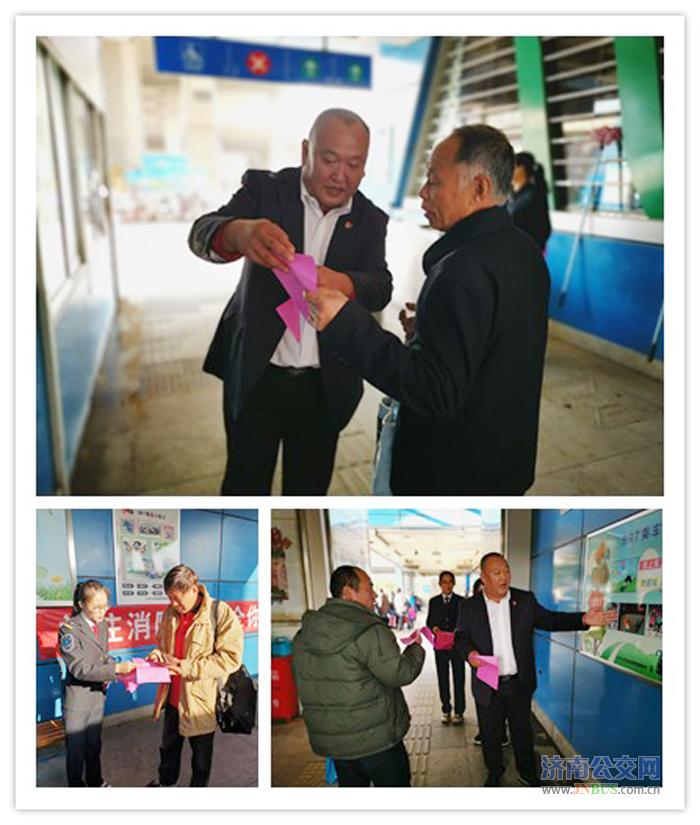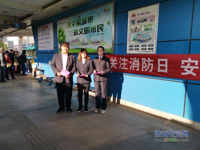 济南公交官网讯 11月9日全国消防安全宣传教育日,七分公司管理人员与BRT站台高星级站务员谢兆霞、葛秀萍等在客流量比较集中的全福立交桥西站台为乘车市民讲解消防知识并发放消防宣传单。