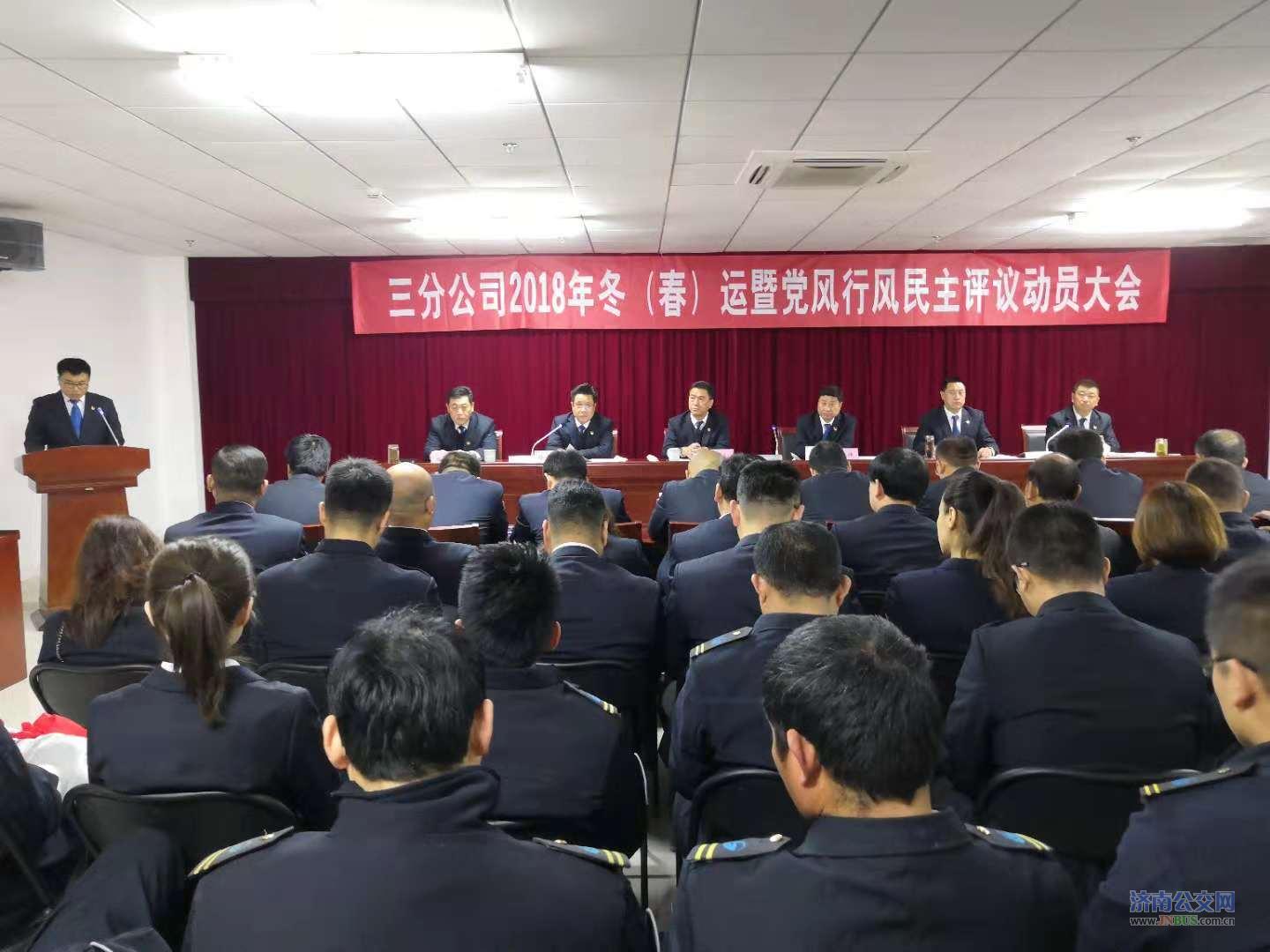 济南公交官网讯 为认真贯彻落实总公司动员大会精神和石总的讲话要求,11月10日上午,三分公司召开2018年冬(春)运暨行评工作动员大会,公司经理尹晓伸向三分公司全体干部职工发出了齐心协力打好冬(春)运及行评攻坚战的有力号召,就扎实开展好两项工作进行了细致部署,总公司副总经理姜良向三分公司干部职工提出了明确要求,寄予了殷切期望。公司班子成员、管理人员及驾驶员代表共计80余人参加会议。会议由公司书记蒋有德主持。