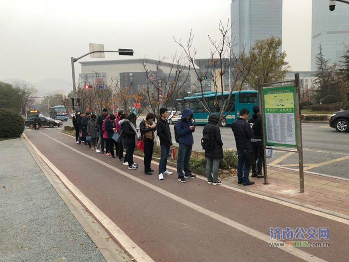 济南公交官网讯 位于俭秀路上的领秀城西门的站点是济南公交南部公司五队39路、T5、T13、T20高峰通勤巴士等公交车的始发站,在每天早高峰,过往行人都能在该乘车点看到这样一个景象:准备搭乘公交车的乘客自觉的排起长长的队伍,有序登乘公交车辆,乘客之间互相礼让,良好文明乘车风气让人如沐春风。