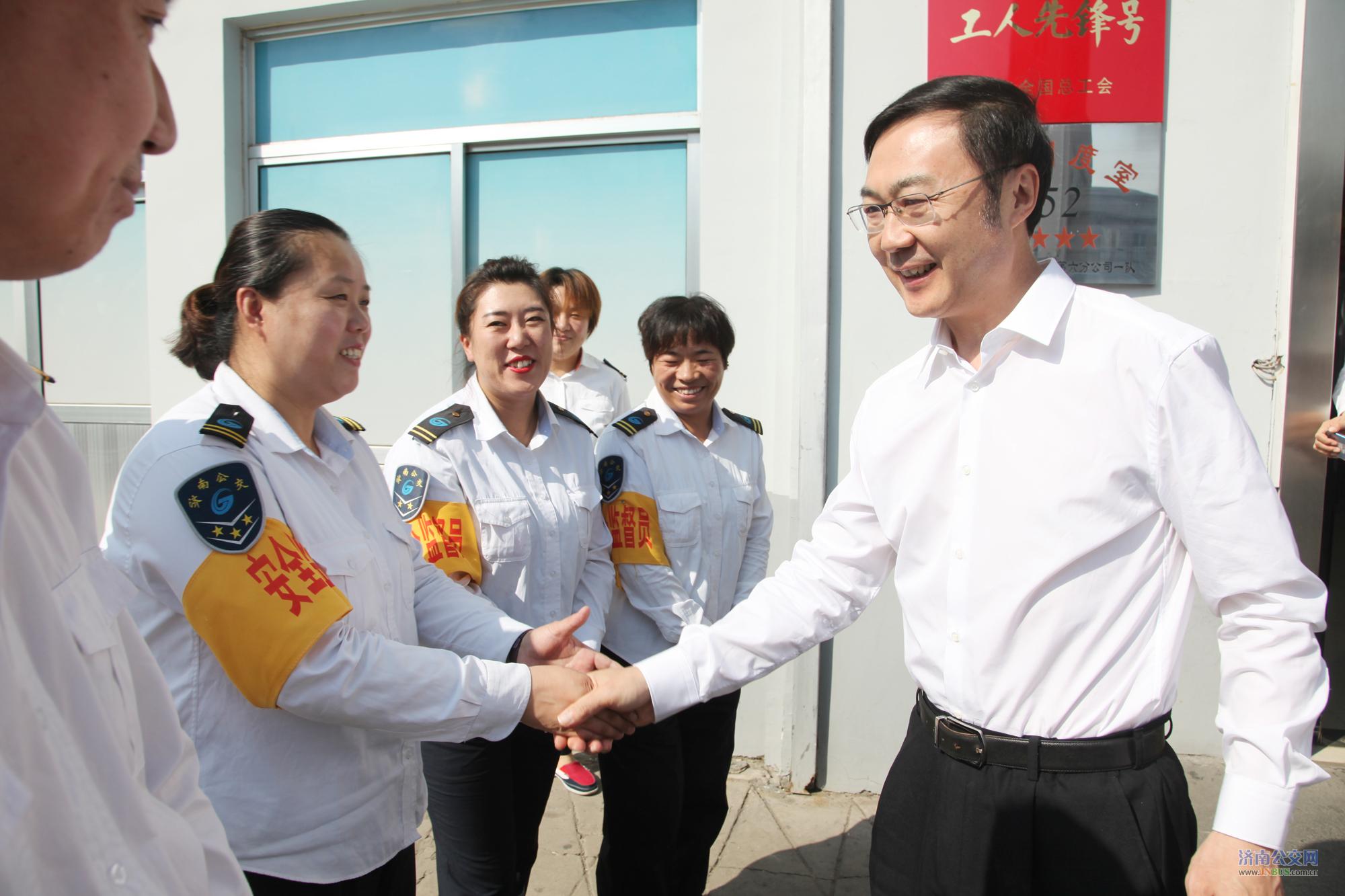 23日上午9:30,杨峰部长一行驱车来到济南市公共交通总公司,与等候在那里的全国道德模范提名奖获得者、K52路驾驶员董丹,市城乡交通运输局副局长罗卫东,济南公交总经理石军、班子成员及职工代表一一亲切握手,并向全体公交职工表示敬意和节日的问候,代表市委、市政府向董丹颁发慰问金。随后,在K52路公交站房进行了座谈。