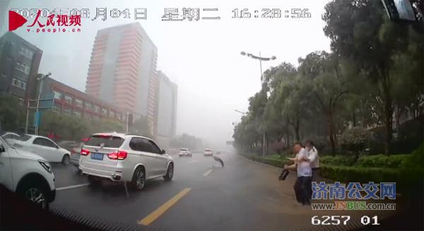 济南公交官网讯 8月4日下午,济南再遭大雨突袭。16点28分,在济南经十纬一路,济南公交K202路驾驶员刘爱忠刚驶出站牌,突然发现前方一位老人被狂风吹倒,老人倒在积水中,挣扎了几下也没能站起来,雨伞也被吹到了路中央。见此情景,刘爱忠马上靠边停车,跳下车跑向老人。他先是从水中把老人扶起,等老人站稳,又赶紧跑到马路中央,给老人拿回雨伞,为老人打着雨伞把老人扶到路边。老人安全了!刘爱忠又急忙跑回车上,不顾全身已经湿透,继续投入到运营中。