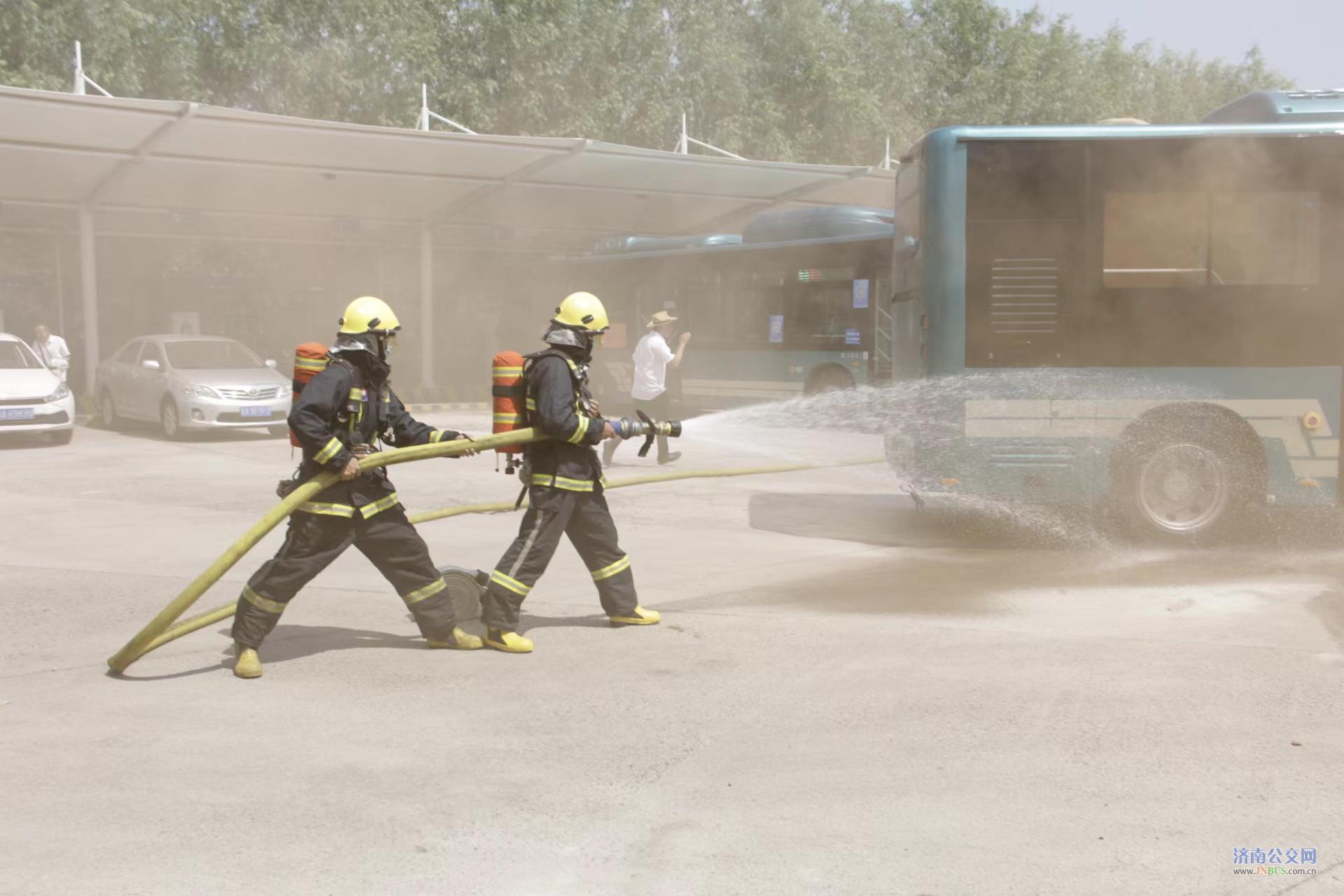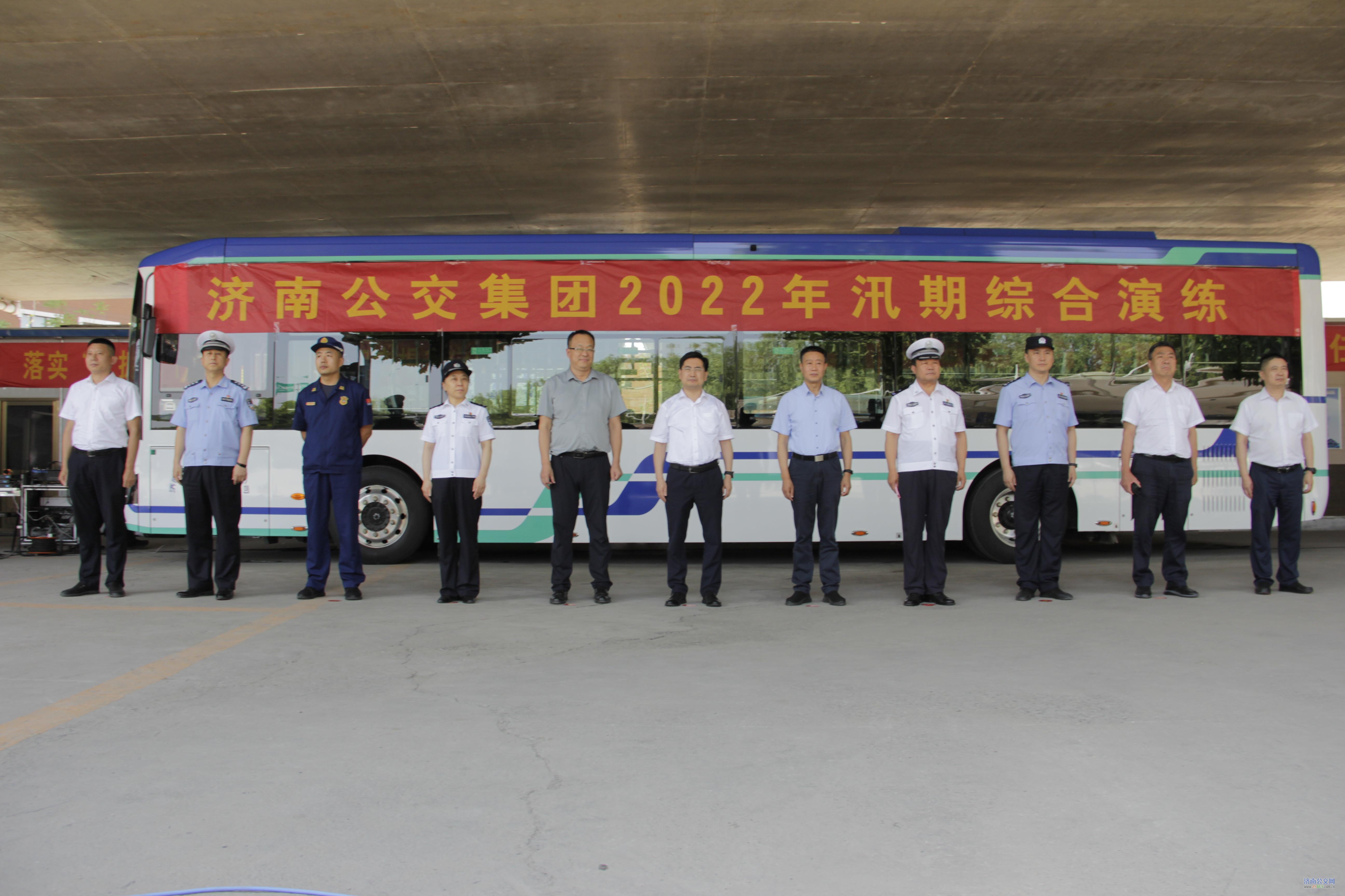 济南市城乡交通运输局、应急管理局、消防救援支队、公安局轨道公交分局、公安局交警支队、防汛抗旱指挥部办公室等领导莅临指导演练。济南公交集团部分班子成员、所属各单位主要负责人、安全副经理、安保部部长及及驾驶员代表百余人参加演练活动。
