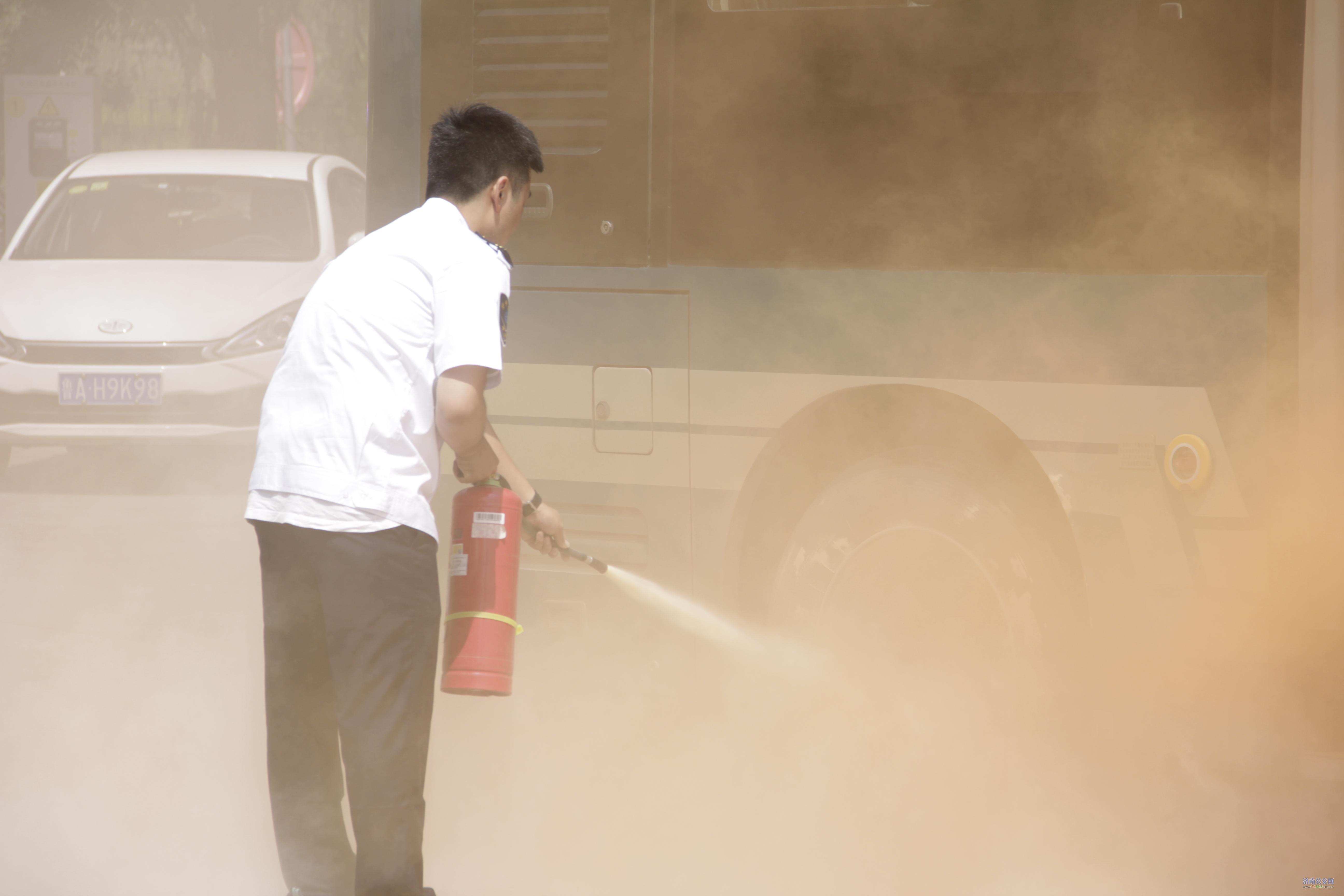 在公交车辆起火逃生应急演练中,一辆满载乘客的公交车车内突现明火,浓烟滚滚,驾驶员按照防恐应急预案要求,立即停车,打开车门组织疏散乘客有序下车,对初起火情进行扑救,确保乘客在第一时间安全疏散,救援队员第一时间到达现场对车辆火情进行扑救。