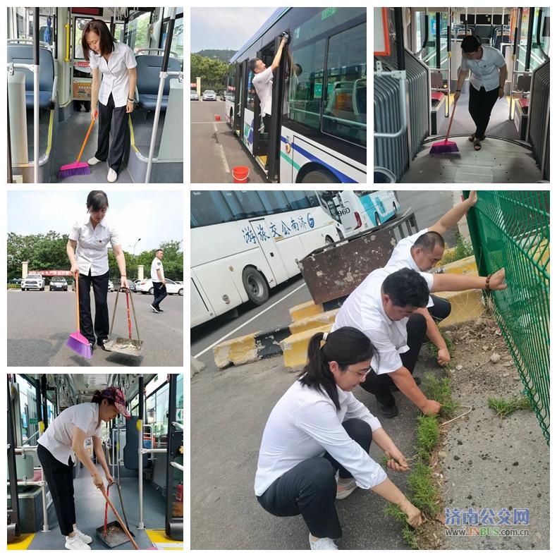 干线公司班子成员以身作则、身先士卒,带领党员对场区卫生进行清理,拔杂草、擦拭座椅、扶手杆以及车窗,炎热的夏日挡不住大家劳动的热情。