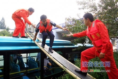 6月27日下午,烈日炎炎,在段店立交桥下,一辆81路公交车停靠在路边,一名乘客从公交车的天窗内爬出,在三名救援人员的搀扶下,顺着架在车上的梯子顺利转移到安全地带。不寻常的举动吸引了过往行人驻足,纷纷疑问:怎么了?经在场工作人员解释,市民才明白,原来,为了确保乘客汛期乘车安全,进一步增强汛情发生时公交救援的快速反应能力,公交电车公司与维修公司联合正在进行防汛演习。