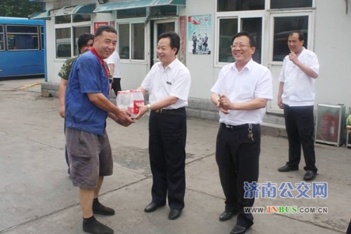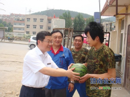 昨天,济南出现高温天气,最高气温在38℃。维修公司党委书记、经理王培海,党委副书记、工会主席车立山,副经理王公义、张东业率领机关部门工作人员,深入地处偏远、维修现场较艰苦站点,察看了这些露天维修现场及车辆情况,并为他们送去了西瓜、矿泉水等防暑降温品。