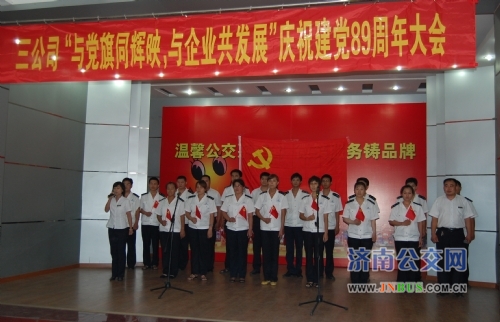 在鲜红的党旗下,公司副经理李元毅带领新党员庄严宣誓、老党员重温入党誓词。随后,公司党委书记、经理曲修业为公司党员上了一堂生动的党课,并对公司的党建工作进行了部署。他要求,各级党员要立足岗位,坚定理想信念,弘扬奉献精神,求真务实,树立清廉形象,争先创优,为新形式下实现济南公交更好更快发展做出更大的贡献。