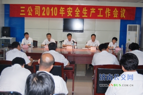 济南公交官网讯 7月23日下午,三公司在刘智远会议室召开2010年上半年安全工作会议。公交总公司副总经理姜良、总公司安全保卫部副部长尹晓申出席会议。三公司领导班子成员、各车队部室负责人及管理人员40余人参加会议。会议由三公司副经理裴东林主持。