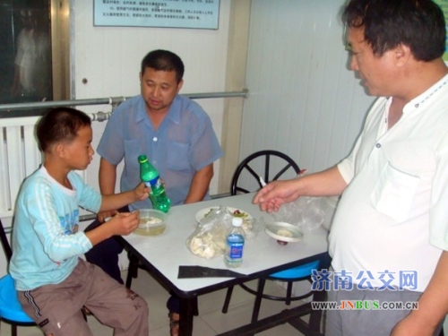 济南公交官网讯 8月1日晚23:15分,安保公司三中队护场员宋建华、孙玉义对停车场进行安防巡查时,一名10岁左右男孩边走边哭着进入了停车场。护场人员立即上前进行询问,但因男孩持外地口音无法深入了解,在稳定男孩情绪后,两名护场员及时上报安保公司并拨打了110报警。随后,通过写字的方式了解到,男孩名叫杨迪,12岁,上小学四年级,贵州人,暑假随打工父母来到济南,早上出行时与父母走散,而且一天没吃东西了。护场员宋建华立即拿出自己的晚饭给男孩吃。23:28分,110民警赶到,了解情况后将男孩带回新城派出所。