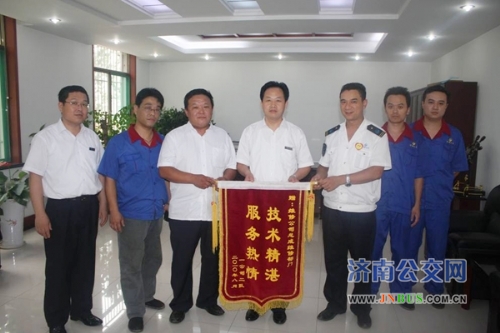 昨天中午,济南公交一公司二队机务员路刚及代班员来到维修公司,代表车队赠送了书写着“服务热情 技术精湛”的锦旗,感谢维修公司大修分公司总成修理的维修人员热情为一线服务,利用废件,以精湛的维修技术为车队增加了经济效益,节约了成本。