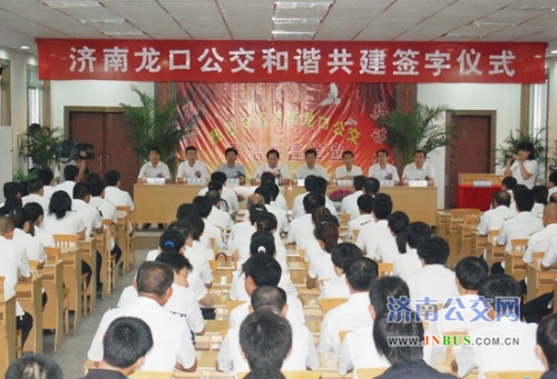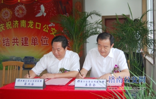在热烈的掌声中,济南市公共交通总公司党委书记、总经理薛兴海与龙口市公共汽车公司总经理姜荣会签署了共建协议。薛兴海总经理在致辞中对龙口市委、市政府和交通局的大力支持表示感谢,向拼搏进取、开拓创新的龙口公交全体干部职工表示崇高的敬意和诚挚的问候。他说,龙口公交在市委、市政府的大力支持下,经过龙口公交职工的共同努力,各项工作取得了显著的成绩,先后荣获“烟台市文明单位”、“山东省规范化服务先进车组”、“青年文明号”以及“全国红旗客车”等荣誉称号。此次119路与10路结为共建线路,在两地公交间又架设了一条连接友谊、通向辉煌的桥梁,必将推动两地公交更好地合作与交流,推动两地公交实现又好又快地发展,为两市经济社会和公交事业的共同发展做出更大的贡献