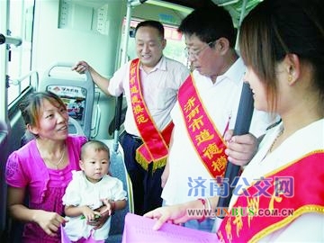 昨天上午,济南公交电车公司邀请济南市道德模范来到电车七队,同驾驶员一起向乘客发放文明市民宣传单。