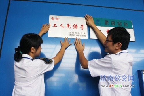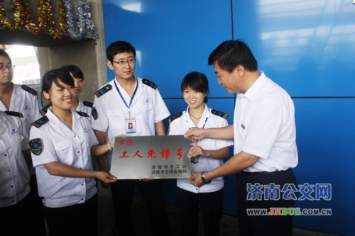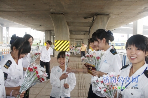 济南公交总公司副总经理石军来到BRT-4号线全福立交桥北站台,代表总公司领导向快速公交公司表示祝贺,石总和站务员一起将“争创工人先锋号”的标牌悬挂在站台上。为庆祝BRT-4号线一周岁生日,站务员杨景、刘倩、赵欣茹、周玉荣、李洋等特意将站台装扮一新,购买来1000朵康乃馨,赠送给BRT-4号线所有站台乘车的乘客。康乃馨寓意着热情、真情和温馨的祝福,快速公交的站务员们希望用一支支盛开的康乃馨,感谢一年来乘客对快速公交的支持和认可,送上济南公交对乘客的一份温馨祝福。