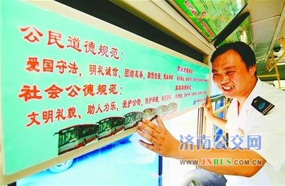 公交一公司六队33路驾驶员吴立明在车上安装公民道德规范标语牌,向乘客宣传文明礼貌、助人为乐等道德规范。