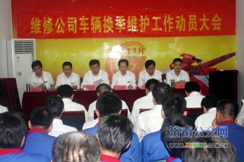 济南公交官网9月28日讯 为做好2010年车辆换季维护工作,保证冬运期间车辆技术状况良好,为营运公司提供更加优质、可靠地车辆保障,9月27日下午维修公司召开了车辆换季维护工作动员大会。总公司副总经理石绍滕,维修公司领导班子成员出席会议。会议由公司党委副书记、工会主席车立山主持。