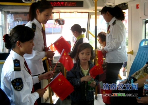 路的高星级驾驶员秦静、安敏和张霞放弃休息时间自费购买了小红旗分发给乘公交车的广大乘客,将节日的祝福送给他们,以此表达对祖国母亲六十一华诞的美好祝福。
