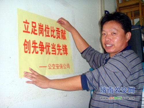 金牛公园站点护场员司庆民正在粘贴活动标语