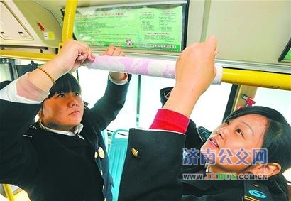 连日来,泉城气温骤降,为了让乘客温暖乘车,昨日济南公交138路车五星级驾驶员在钢制扶手上绑上棉布。
