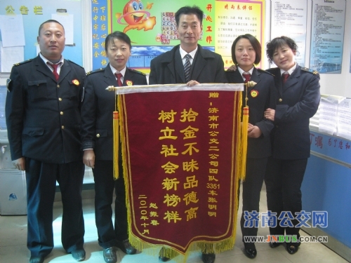 今天中午,赵老师来到112路站房,将一面印有“拾金不昧品德高,树立社会新风尚”字样的锦旗送到112路驾驶员张明明手里,并感激道:“你们公交人拾金不昧品德高,树立了良好的社会风尚。公交人好样的!你们驾驶员好样的!”