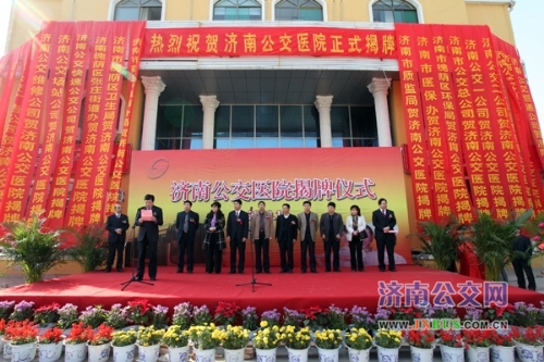 在雄壮的礼炮声中,济南市药监局槐荫分局局长朱茂丽、济南市槐荫区卫生局副局长梁援朝为济南公交医院揭牌。济南市公交总公司党委书记、经理薛兴海致辞,济南市槐荫区卫生局梁援朝副局长向济南公交医院授牌并讲话。