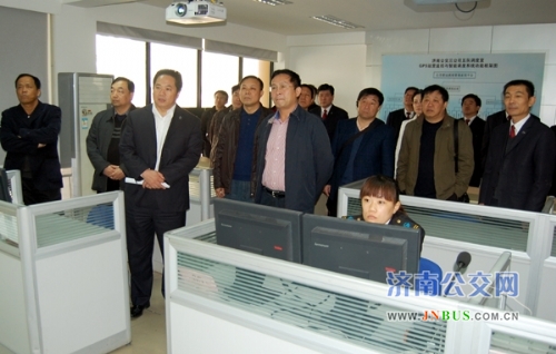 在智能调度室,武汉公交集团的客人听取了车队工作人员关于智能调度系统及3G监控使用的介绍与演示。武汉公交迟董事长对济南公交的发展给予了高度评价,对取得的成就表示了由衷地赞赏。