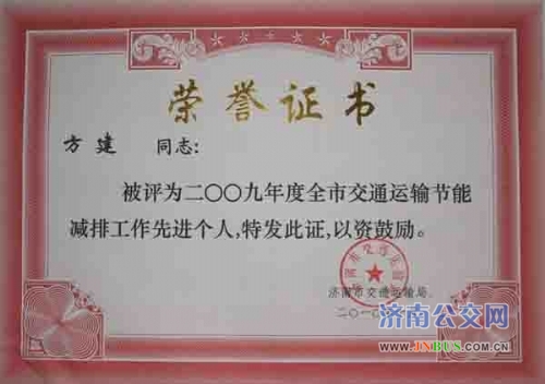 济南公交官网12月3日讯 近日,一公司五队49路驾驶员方健被评为2009年度全市交通运输节能减排工作先进个人。