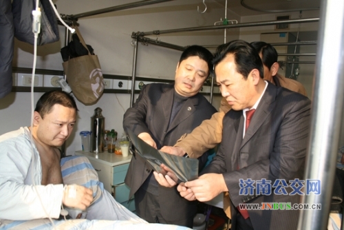 图为恒生公司经理张庆、党委书记段军到医院看望受伤驾驶员杨博。