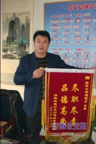 济南公交官网讯 11月24日晚19时48分许,一名男乘客来到北关北路站台入口处,未购票便要进入站台,正在监督投币的站务员发现后及时上前提醒该乘客,请其购票后再进入站台,但该乘客不顾站务员的劝阻强行冲进站台,见该名乘客情绪异常激动,考虑到监督投币的站务员为女性,保安曾昭岩同志便让站务员回到操作间,由自己上前制止该乘客进入站台,并试图通过耐心解释安抚乘客情绪,但该乘客对曾昭岩的劝阻不但充耳不闻,反而气焰越发的嚣张,摘下身上的背包返身回到出入口处一辆停放的摩托车前,从车上取下一把管制刀具再次返回站台对曾昭岩和站务员进行威胁。面对突如其来的险情,考虑到站台乘客的乘车安全,以及自身所承担的保安人员的职责,曾昭岩同志勇敢面对,再次协助站务员对乘客情绪进行安抚,在劝阻无效后,果断拨打了110报警电话,有效的遏制了事态的继续恶化。