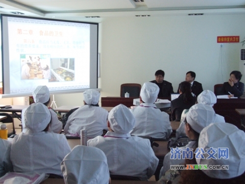 济南公交官网讯 为提高小食堂工作人员的服务意识和食堂工作水平,12月21日下午,电车公司在职工培训中心对小食堂人员进行专题培训。总公司党委副书记、工会主席刘波和总公司机关相关部门负责人及电车公司主要负责人到会指导。