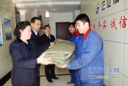 12月21日,总公司工会给维修公司修理工送来了棉被等物品。近期,天气大幅度降温,为做好车辆保障工作,切实保证遇有寒潮、降雪等恶劣天气出全车、出好车,维修公司部分维修人员需要住到站点,在出车前对车辆进行全面检查,并协助驾驶员发动车辆。广大修理人员表示感谢总公司领导关心,将继续做好本职工作,为营运一线提供可靠、放心的车辆,为公交的发展做出积极贡献。