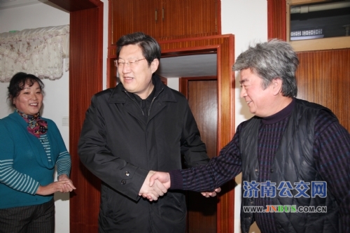 随后,张建国市长一行又来到济南市劳动模范、济南公交电车公司102路女驾驶员徐维玉家中走访慰问。张建国说,市委、市政府对在工作中作出过突出贡献的劳模十分关心。春节临近,我代表市委、市政府来看望你们,祝你们身体健康、阖家幸福。他还详细了解了徐维玉一家人的工作生活情况,关切地询问有没有困难需要解决。徐维玉在工作中始终秉承“让乘客满意、让政府放心、让员工快乐、为社会奉献”企业核心价值观, 她常说,我微笑服务的目的就是让乘客高兴,乐意乘坐我开的车。徐维玉的质朴话语代表了11000多名公交员工朴实无华的心。对于自己的“衣食父母”,她用微笑表达着感恩的心情。每当有乘客问路,徐维玉总是拿出车队自制的微笑服务便民条,详细地画出换乘站点和路线,自觉争当“老人的儿女、儿童的家长、游客的向导、病人的陪护、残疾人的亲人、精神文明的传播者”,受到广大乘客的一致称赞。2009年11月,徐维玉被评为“全运微笑使者”。张建国市长勉励徐维玉在新的一年里,发扬成绩,努力工作,为乘客出行服好务。”徐维玉激动地表示:“感谢市委、市政府和市总工会领导对我们劳模的关心和培养,感谢张建国市长在百忙之中来看望我们驾驶员。我们一定要努力工作,为百姓出行服好务,全心全意当好百姓的‘专职司机’,请市长放心!” 张建国市长听后,笑着连声称赞。