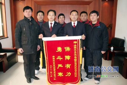 济南公交官网讯 1月21日 ,电车公司一队队长张庭峰、机务员李力等人来到维修公司,代表电车一队赠送了书写着“勇斗严寒保障有力”的锦旗,感谢维修三分公司五院站点为做好车队冬运车辆保障工作所作出的努力。