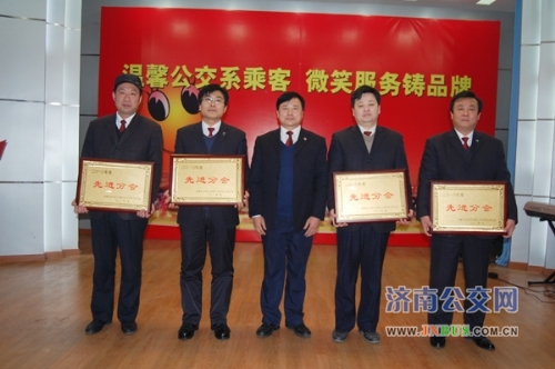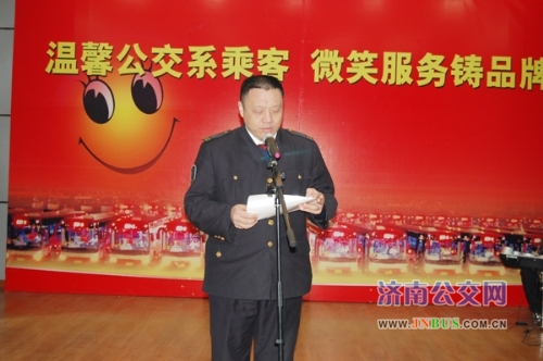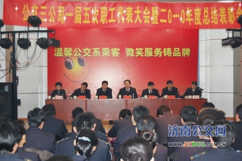 济南公交官网讯 22日上午,三公司一届五次职工代表大会暨二0一0年度总结表彰会在总公司礼堂隆重举行。市交通运输局副局长、总公司党委书记、总经理薛兴海,党委副书记刘波,副总经理李双喜,副总经理石少腾,副总经理姜良出席会议。公司班子成员以及管理人员、职工代表一百二十余人参加大会,共谋发展大计,共庆新春佳节。会议由公司党委副书记、工会主席安丽主持。