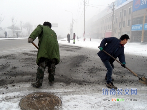 团员突击队根据总公司团委指示,14日凌晨到济洛路、清河北路等公交运行的路段清除积雪,撒沙防滑,确保车辆正常行驶,保证运行一线车辆的安全行驶。
