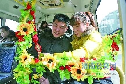 2月14日就是情人节了,13日,一辆K93路公交车里,一对情侣幸福地坐在了一处围满花朵的“情侣座”上。原来,这是K93路驾驶员张同锋特意为情侣乘客装扮的“节日座”。