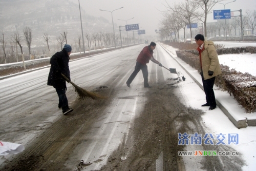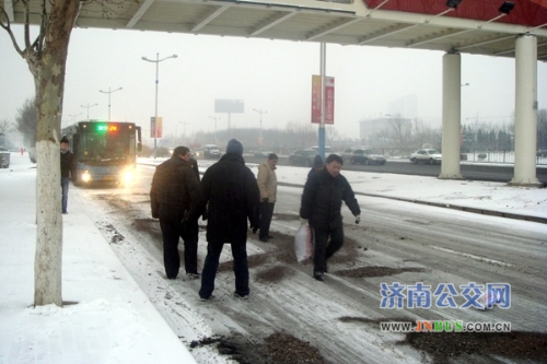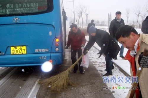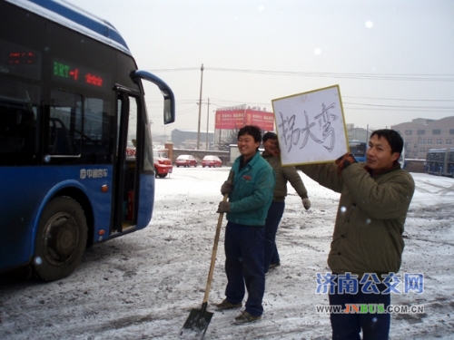济南公交官网2011年2月14日讯 2月13日,泉城济南普降瑞雪,因路面湿滑,许多人放弃了自行车和私家车,选择乘坐公交车出行。雪情就是命令,为了保障运行,快速公交公司一队按照公司安排,立即启动《冰雪天气应急预案》。车队管理人员到各大站点维持秩序,疏导乘客,并密切关注客流变化情况,灵活调度;还与车队冬运突击队成员一起到各危险路段撒防滑沙,清除道路积雪,保证车辆正常运行。同时,还在站房内加强对驾驶员的安全叮嘱,要求驾驶员务必降低车速、拉大横向与纵向间距、严禁脱档滑行。就这样,车队管理人员一直忙碌到深夜收车。为了保证第二天的正常运行,车队长带领部分管理人员夜宿车队。第二天一大早,管理人员和冬运突击队成员甚至来不及吃早饭便又奔赴到各危险路段撒沙,保证运行的工作当中。