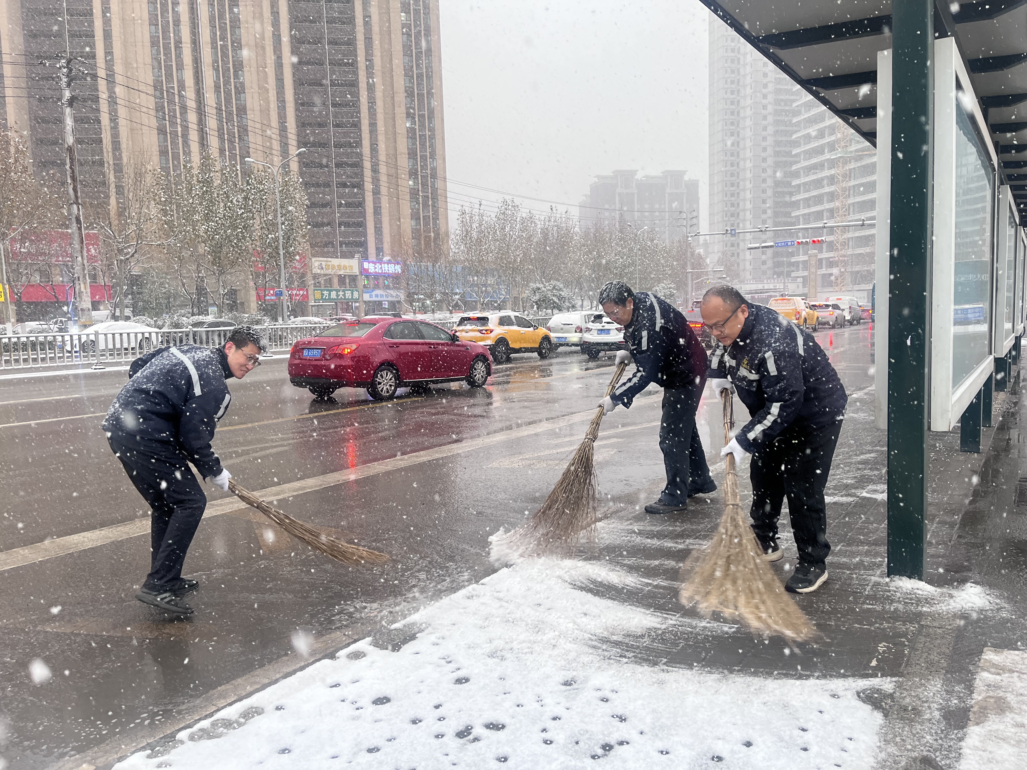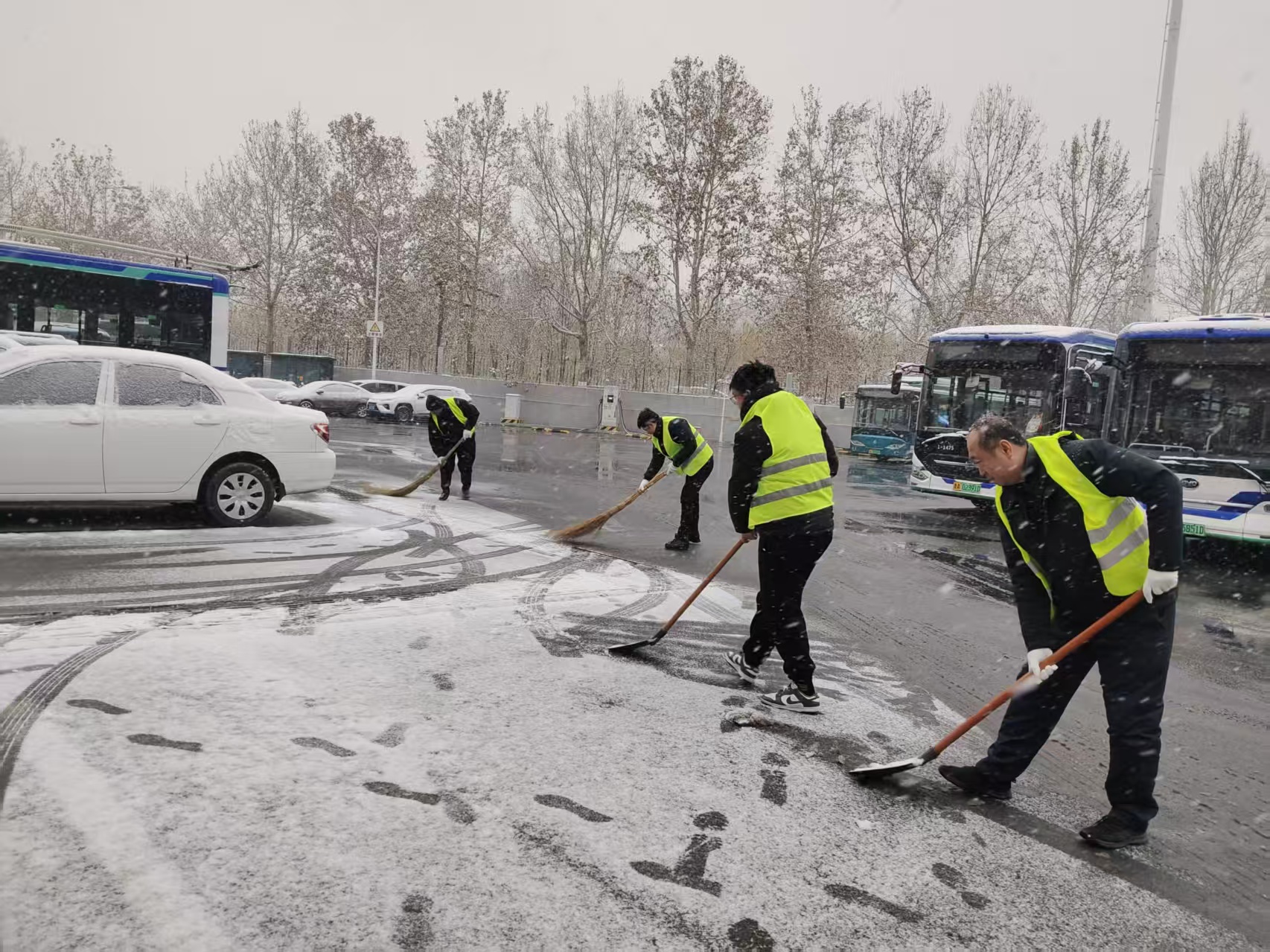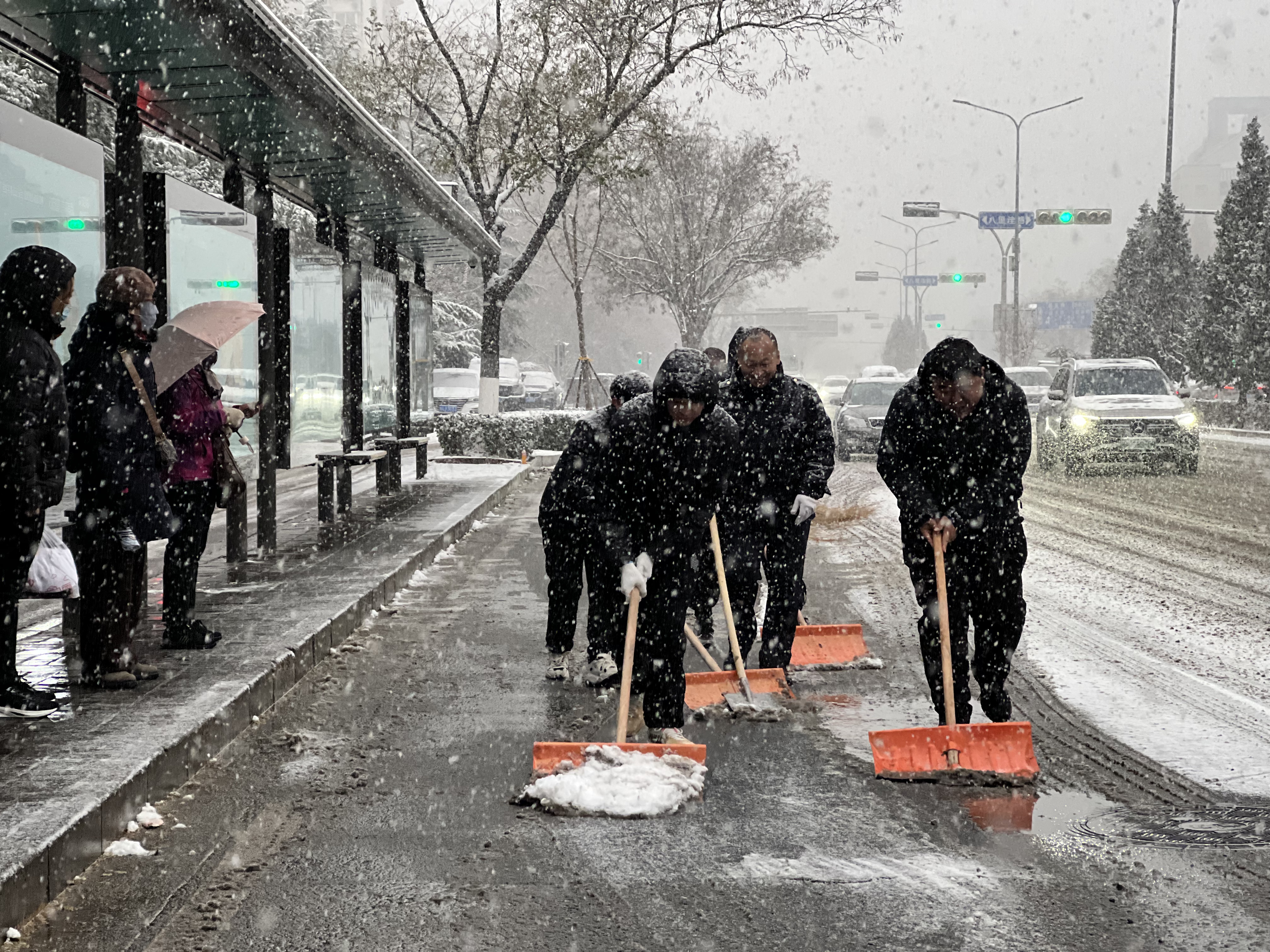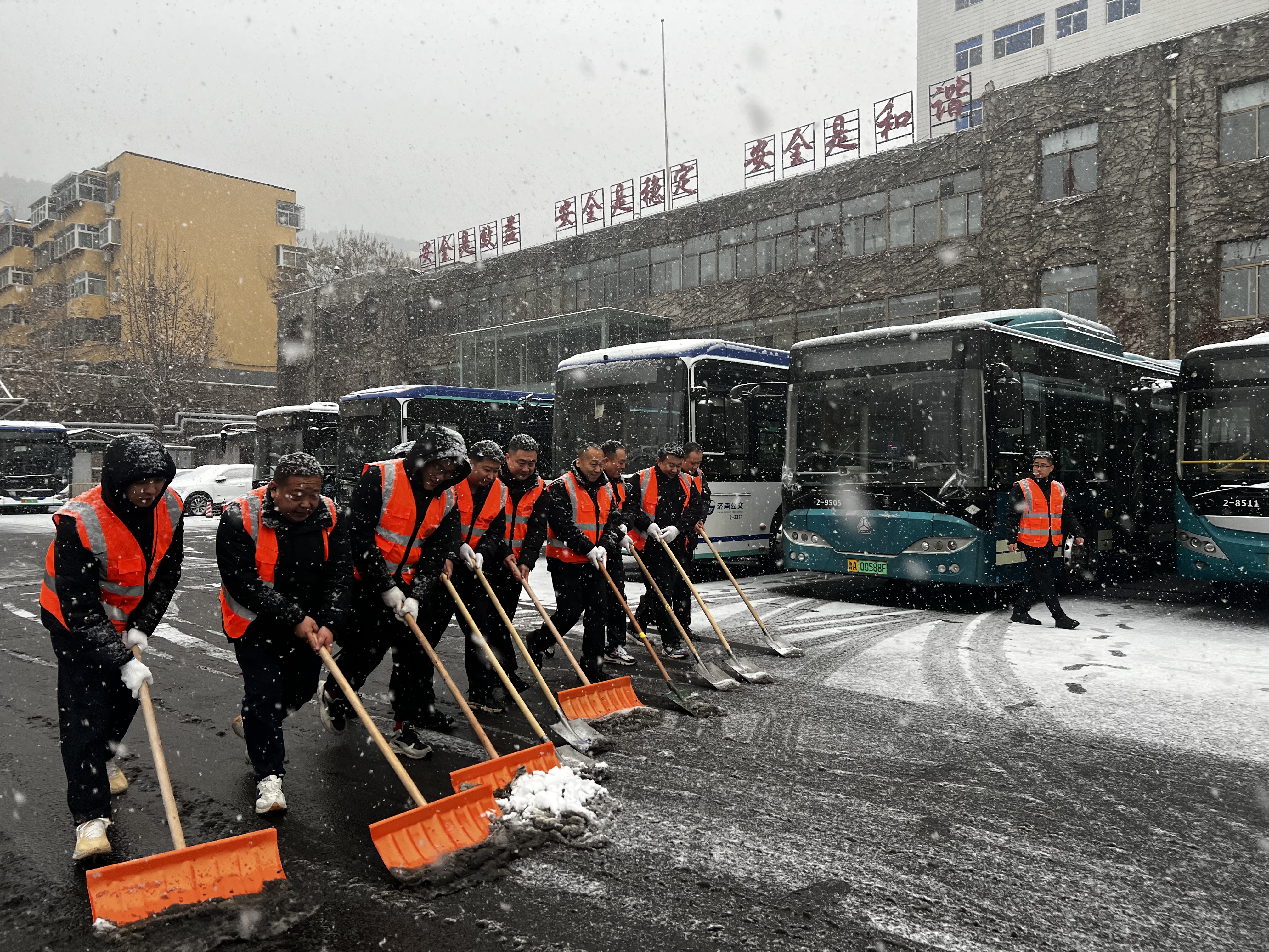 降雪后,济南公交第一时间启动应急预案,各级管理人员做好对所属线路客流节点和危险路段的值守工作,加强监测预警信息通报,实时做好预警信息的第一时间发布和提醒,做好高效响应处置。济南公交提前做好了应急物资准备,配备了融雪剂等应急物资,集团应急突击队员,提前勘查道路通行状况,排除各类安全运行风险,并在道路结冰路段、路口、站台铺撒融雪剂,做好站台清雪的各项准备工作,为市民提供良好候车环境,为市民安全出行保驾护航。