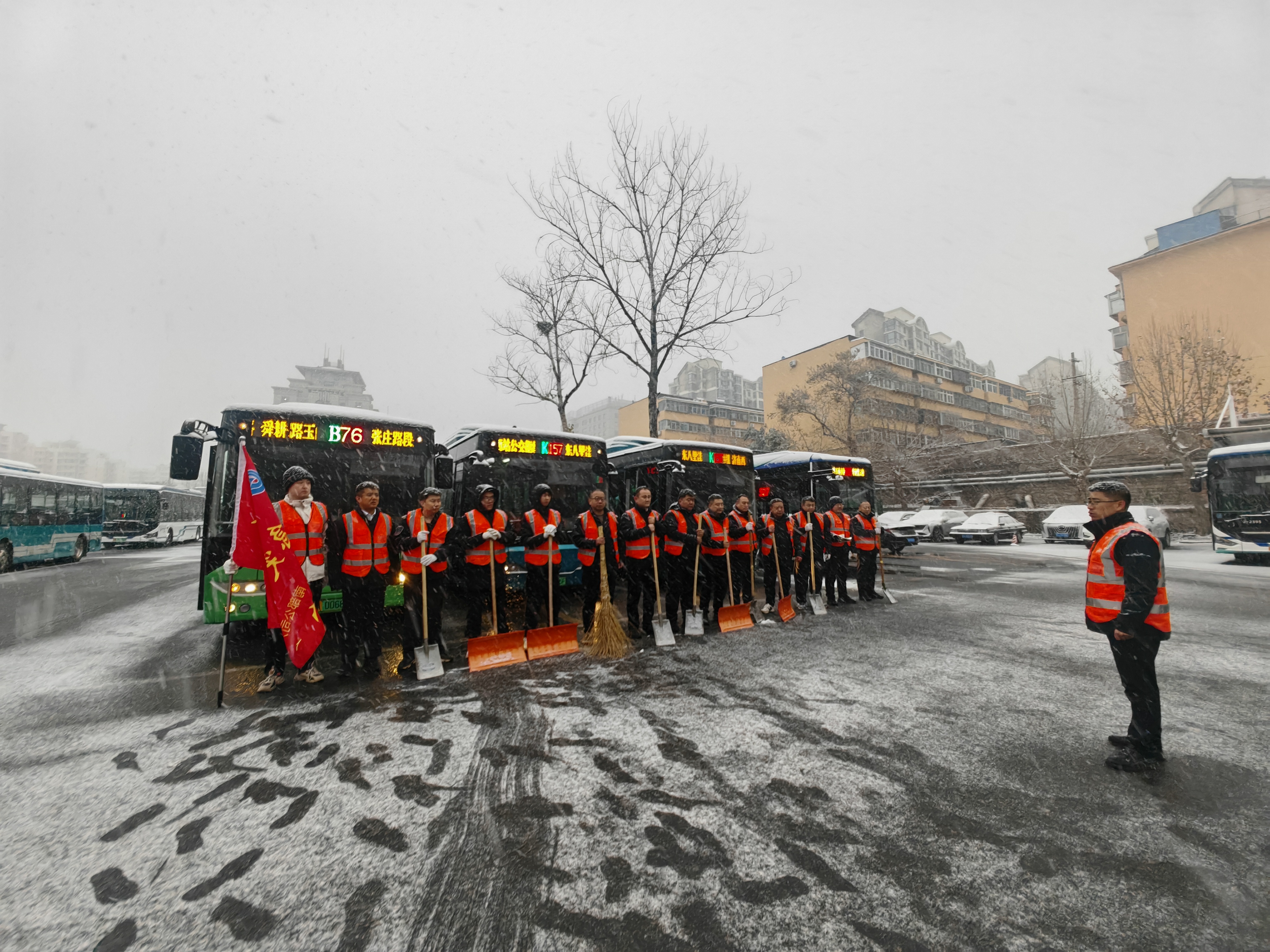 风雪中,济南公交各级管理人员上站上线,前往冰雪湿滑路段实地勘查道路通行状况,在主要客流节点观测客流、维护站点登乘秩序。