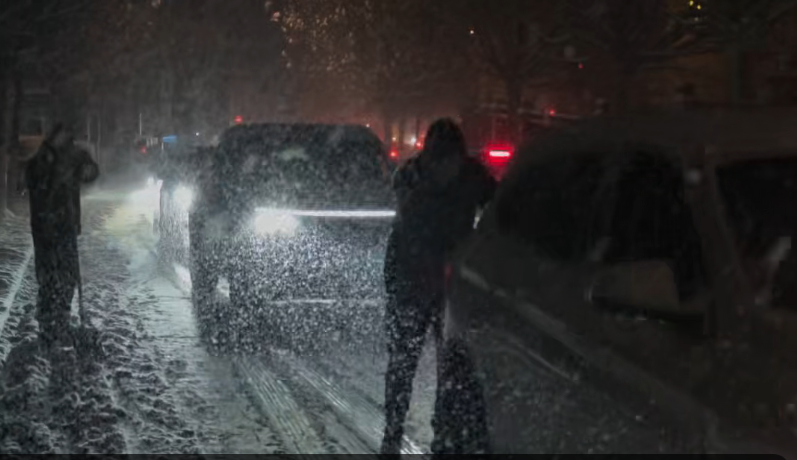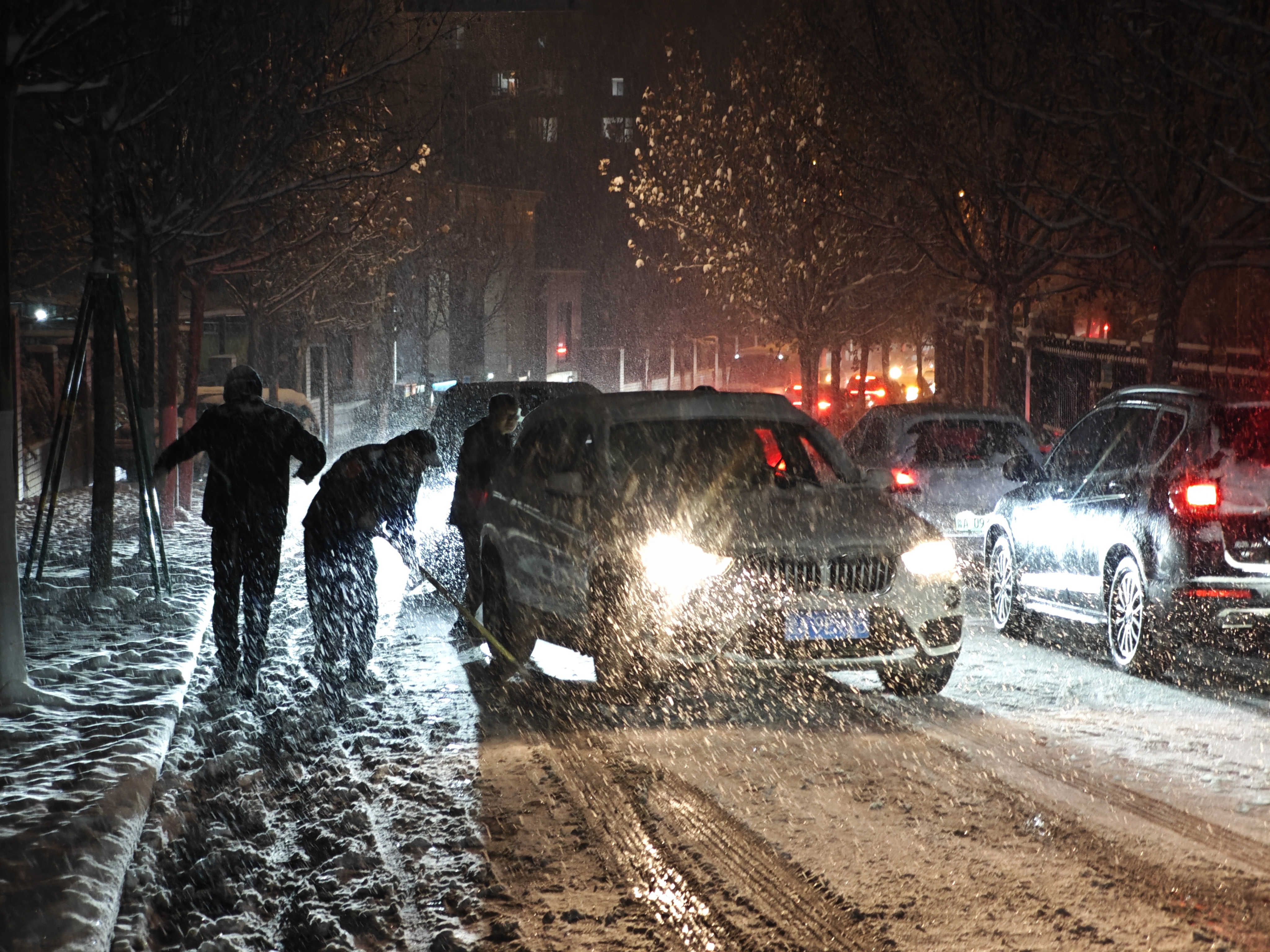 在这艰难时刻,公交人挺身而出,成为雪夜中最温暖的守护者。在荆山东路的上坡处,一辆辆私家车艰难地试图爬坡,却一次次无奈地滑回原地,司机们心急如焚,却又无可奈何。此时,正在执行运营任务的公交驾驶员赵正和同事们发现了这一情况。他们迅速与车内乘客做好解释工作,在得到乘客们的理解与支持后,毫不犹豫地拿起车上的防滑链、铁锹等工具,冲进了风雪中。