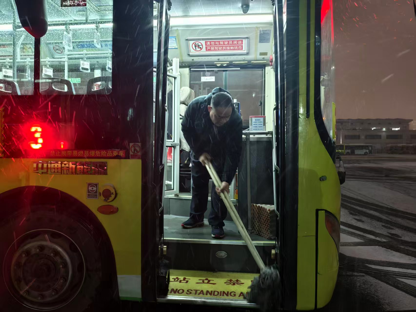 各级管理人员上站点、进场站值班值守,实地勘察道路通行状况,在主要客流节点观测客流、维护站点登乘秩序。驾驶员提前预热车辆,确保车辆暖风系统正常开启,做好车门、踏板等关键部位积雪清理,让乘客上车即享温暖,确保乘车安全。