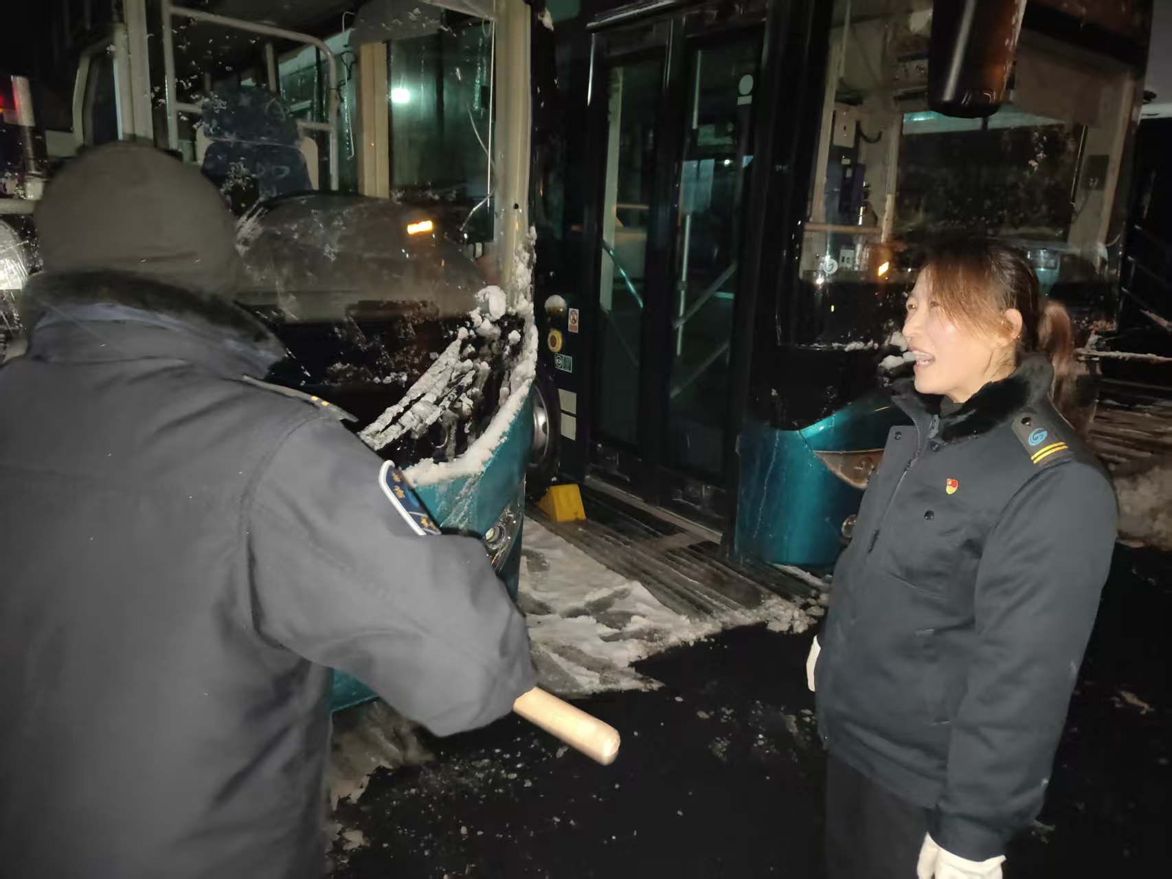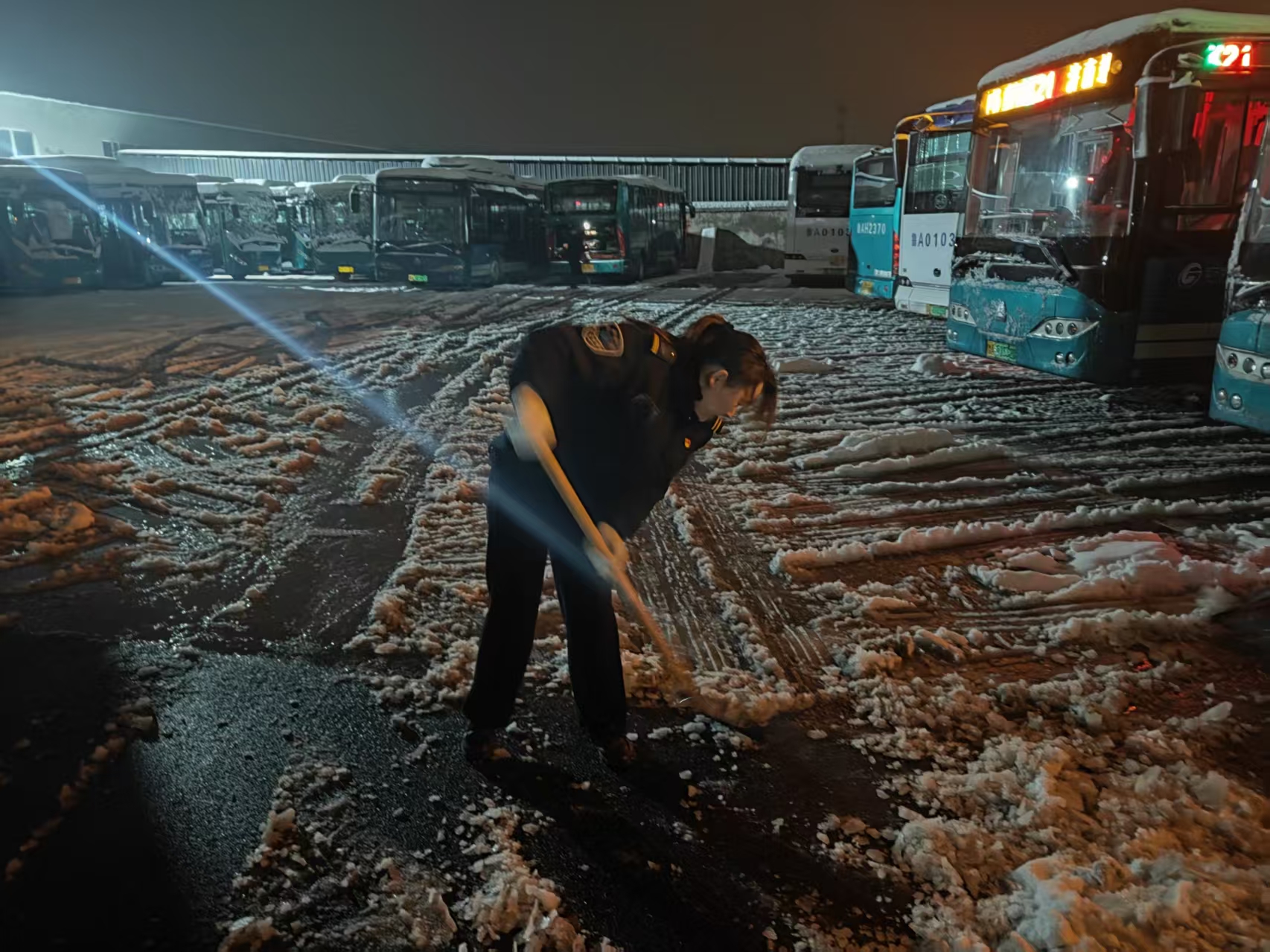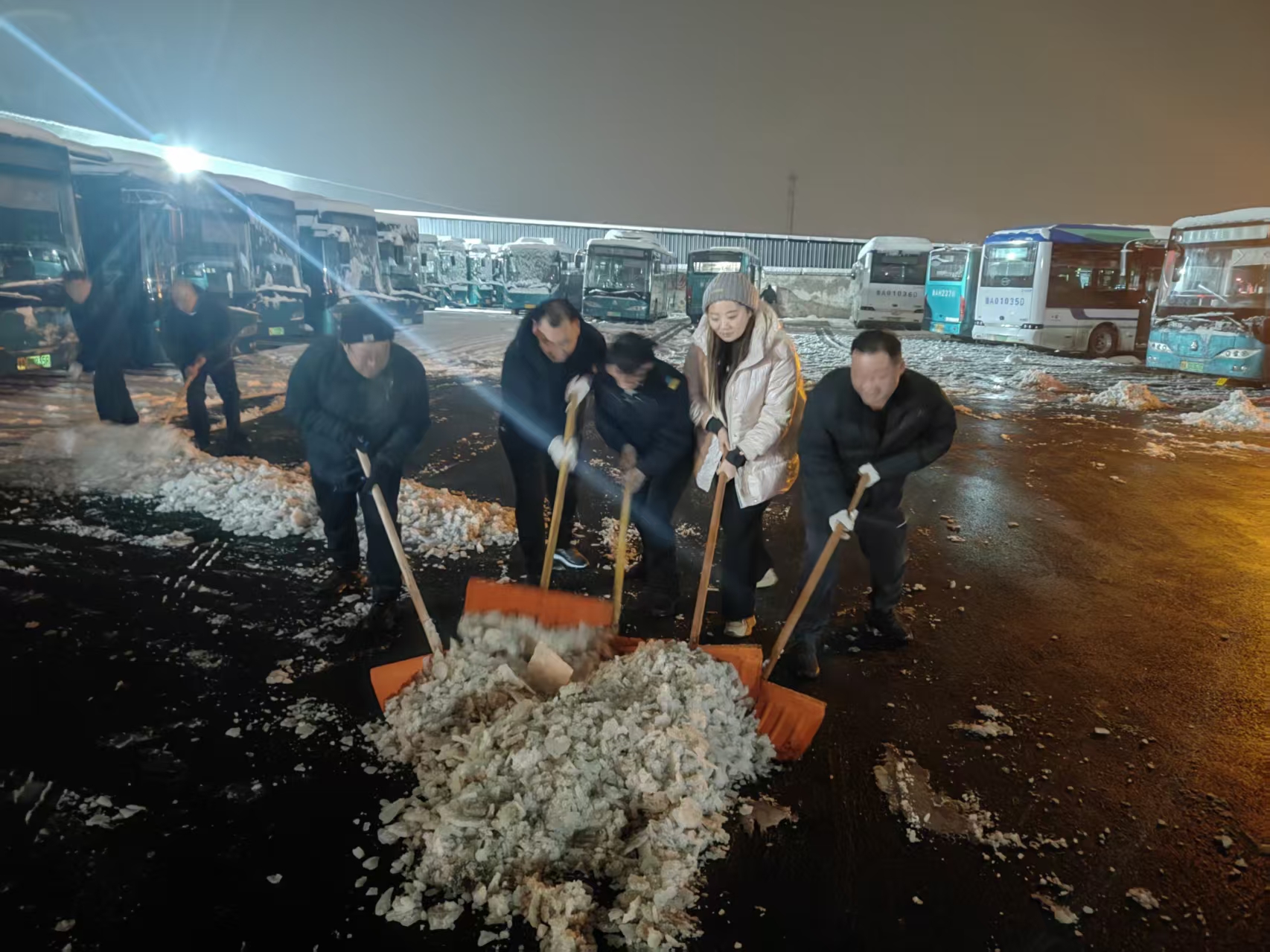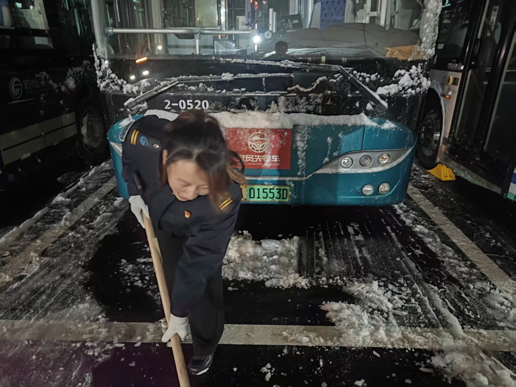 同一场站内,另一幅热火朝天的画面正在上演。由于乡村道路结冰严重,为确保安全,K159路乡村线路暂时停运。但线路停驶,党员的责任从未“停摆”。K159路班组长、党员驾驶员张盼云主动号召并带领班组成员魏荣、倪英英赶往重汽南路场站支援清雪工作。三位女将毫无惧色,拿起雪铲、铁锨,毅然投入清雪除冰的队伍中。她们的身影在众多男同事中格外醒目,挥铲、破冰、清运,动作利落,干劲十足。她们的主动奉献和拼搏精神深深感染了在场的每一个人,场站内的积雪和暗冰被快速有效地清除。