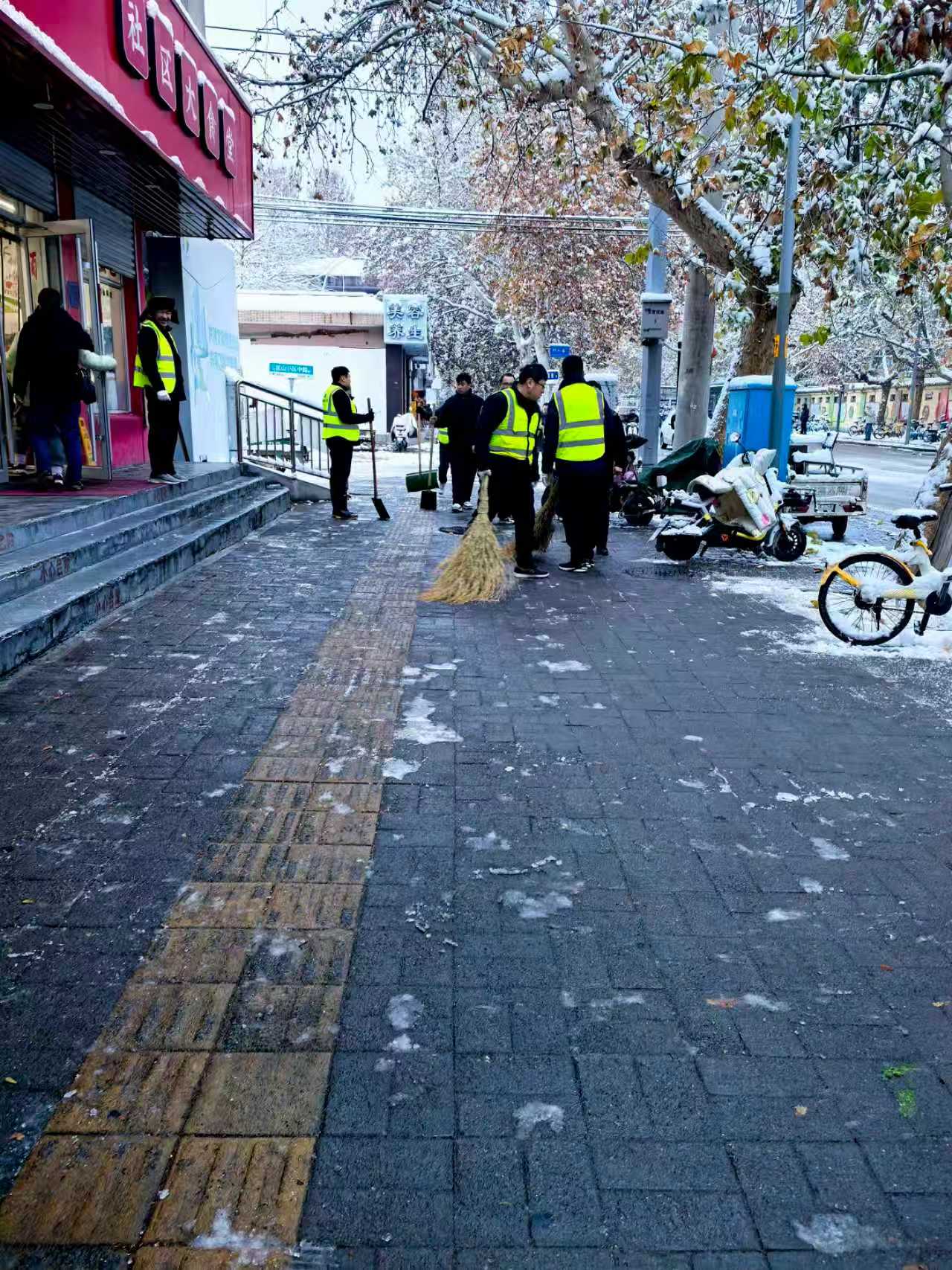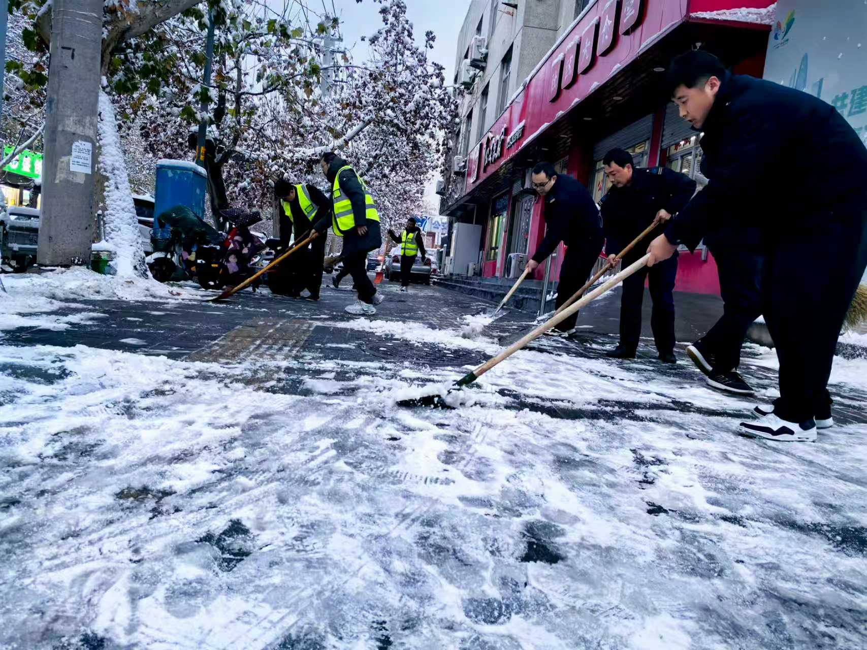 7:00,清雪任务比原计划提前20分钟完成,此时,队员们已鏖战近2小时,棉衣结上一层薄冰,却换来乘客脚下“安全通道”。