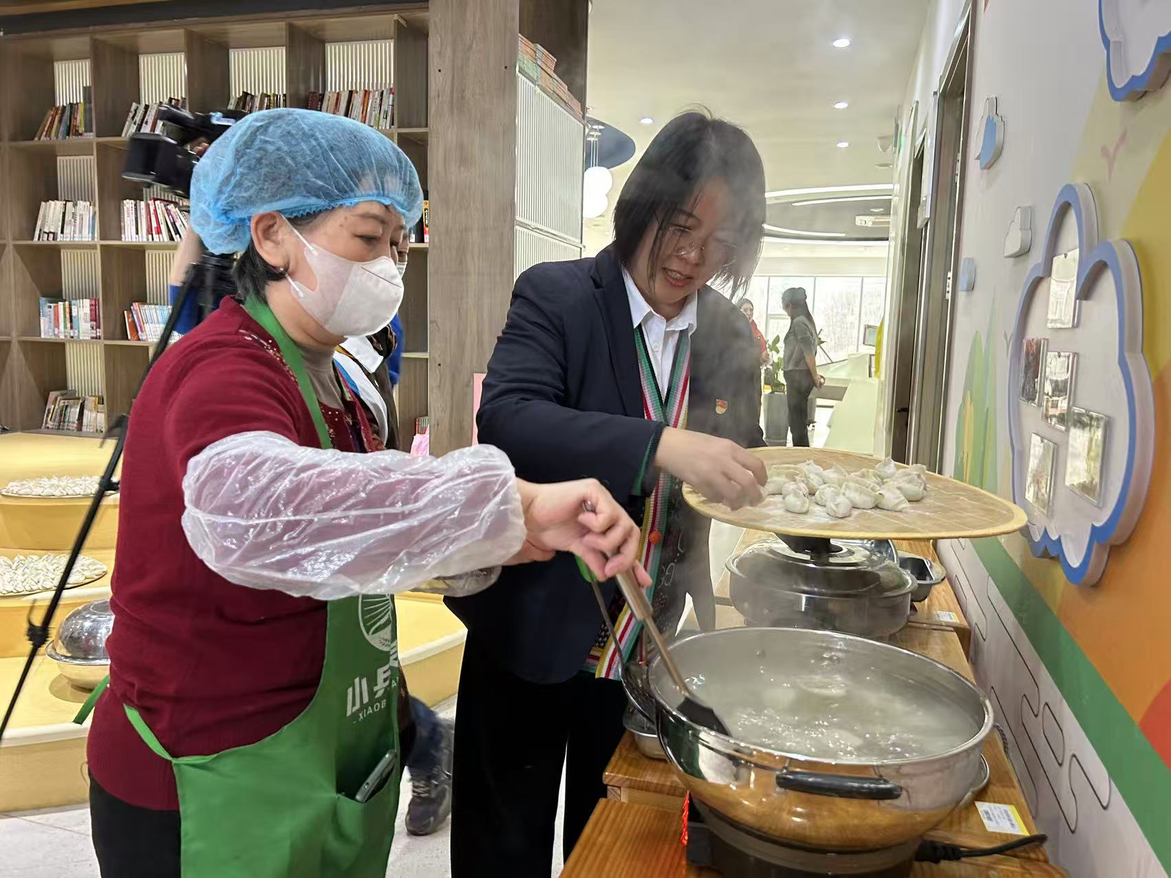 最热闹的是擀皮组。志愿者孙超把擀面杖抡得飞起,三下一转,一张圆月似的皮就“哒”地落在案板上。技术好的“种子选手”李晓玮和王振则被请去最后的“包饺擂台”:放馅、捏褶、收口,十根手指像十只白鸽,扑棱棱就飞出一只只胖嘟嘟的“元宝”。