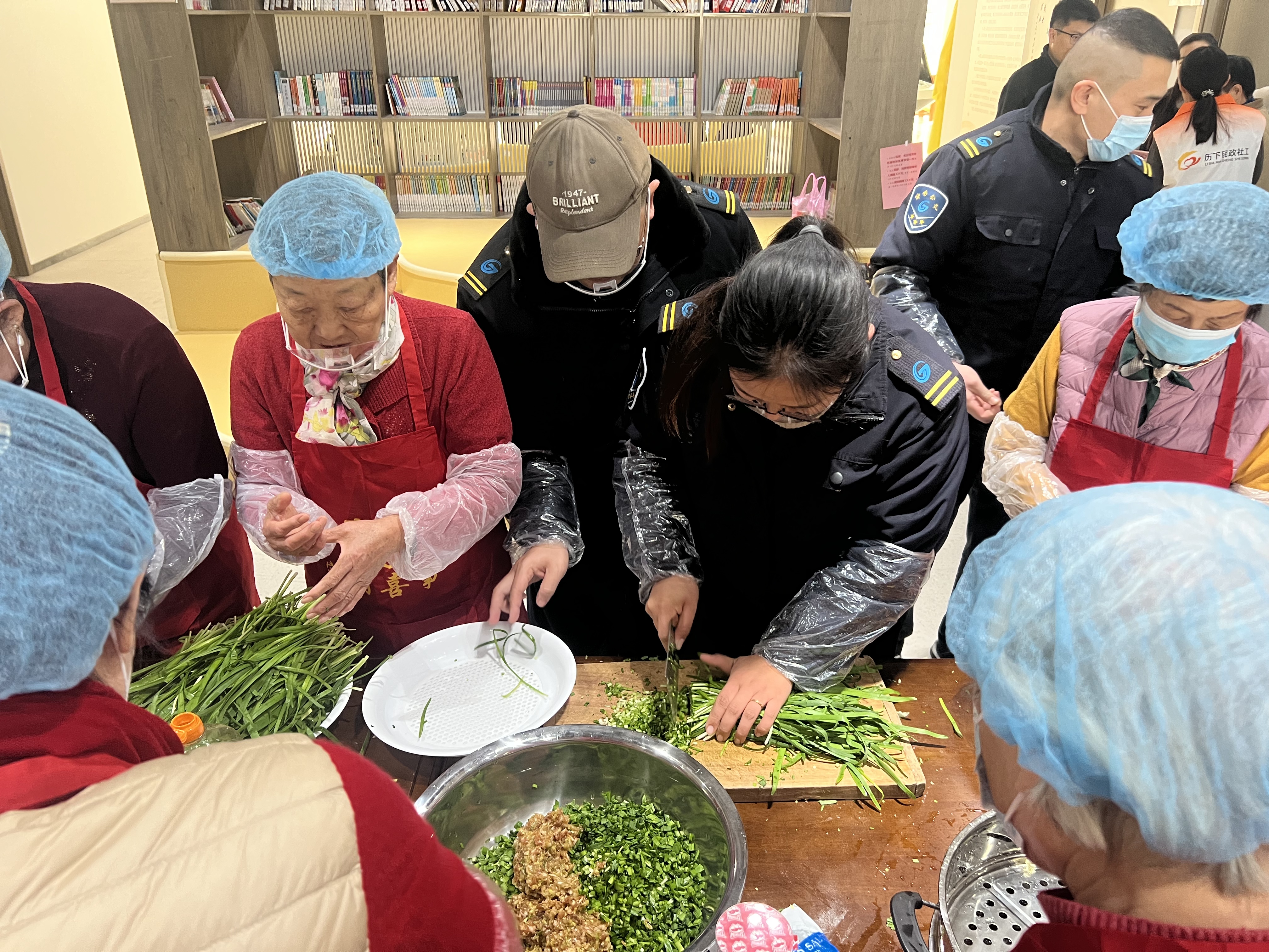 大家把案板一字排开,面粉像小雪一样簌簌落下。和面的公交志愿者朱天把袖子挽到肘弯,胳膊一压一折,散落的面粉就听话的成了团;调馅的社区阿姨手起刀落,菜和肉馅空中跳完最后一支舞,乖乖滚进盆里,料汁一淋,香味弥漫了整个屋。