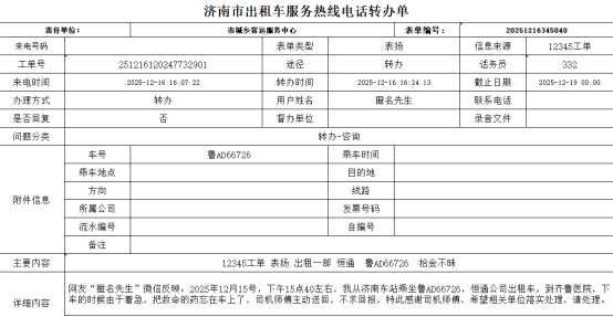 济南公交官网讯 12月17日,公司收到一份表扬工单。事由如下,12月15日下午15时40分左右,济南公交二分公司鲁AD66726车驾驶员李宗玉师傅,在济南东站搭载两位乘客前往齐鲁医院。因乘客急于就医,下车时十分匆忙,不慎将病历、药品等重要物品遗落在车上。